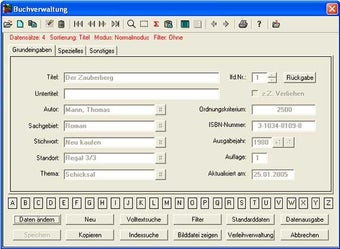 Mit HGS-Buch-Archiv erfasst man alle wichtigen Daten der zu verwaltenden Bücher, darunter Titel, Autoren, Sachgebiete, Verlage, Jahr der Veröffentlichung sowie ISBN-Nummern. Bei Bedarf kann man sogar zu jedem Titel eine knappe Inhaltsangabe speichern. Wer mehrere Exemplare eines Titels besitzt, kann den einzelnen Bücher laufende Nummern zuordnen.